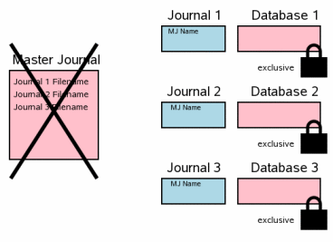 If a power failure or operating system crash occurs at this point, the transaction will not rollback when the system reboots even though there are rollback journals present. The difference is the master journal pathname in the header of the rollback journal. Upon restart, SQLite only considers a journal to be hot and will only playback the journal if there is no master journal filename in the header (which is the case for a single-file commit) or if the master journal file still exists on disk.